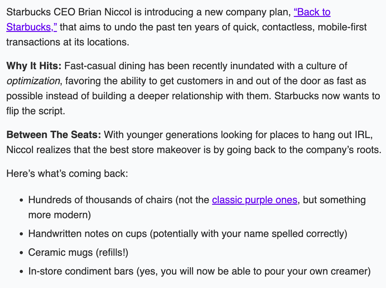 Unfortunately, like many elements of our society over the past 5 years, Starbucks began optimizing for efficiency over enjoyment. The app became the focus. The stores were shoddy, and people only came in for pickups if there wasn’t a drive-thru. In short, the brand lost its soul.