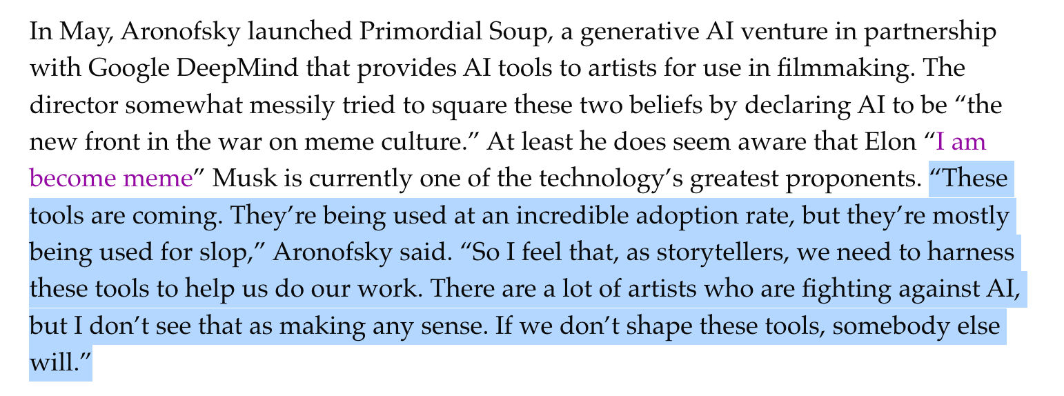 Daniel Kwan says AI is incompatible with the industry. I prefer the Darren Aronofsky approach: